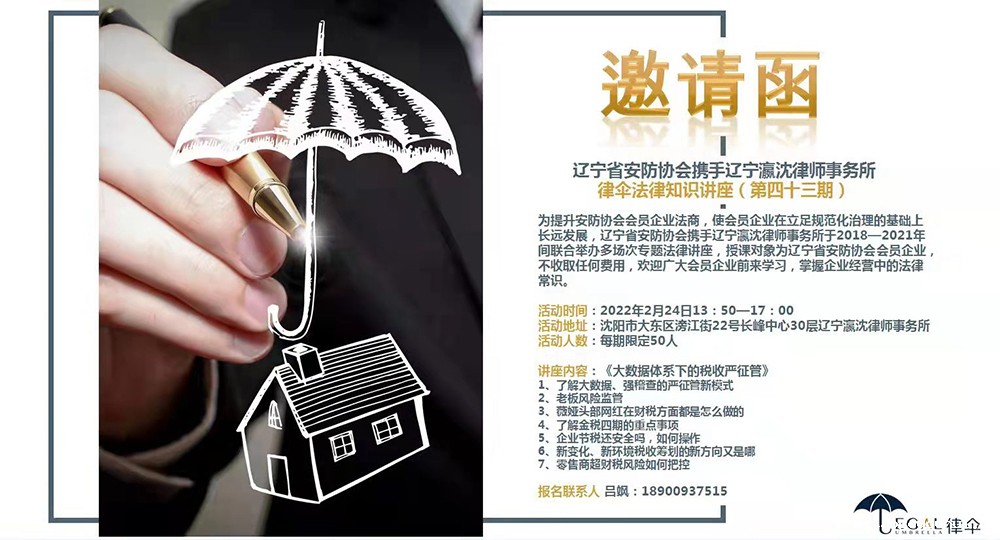 为提升安防协会会员企业法商,使会员企业在立足规范化治理的基础上长远发展,伟德平台官网首页携手辽宁瀛沈律师事务所联合举办了多场次专题法律讲座,授课对象为伟德平台官网首页会员企业,不收取任何费用,欢迎广大会员企业前来学习,掌握企业经营中的法律常识。