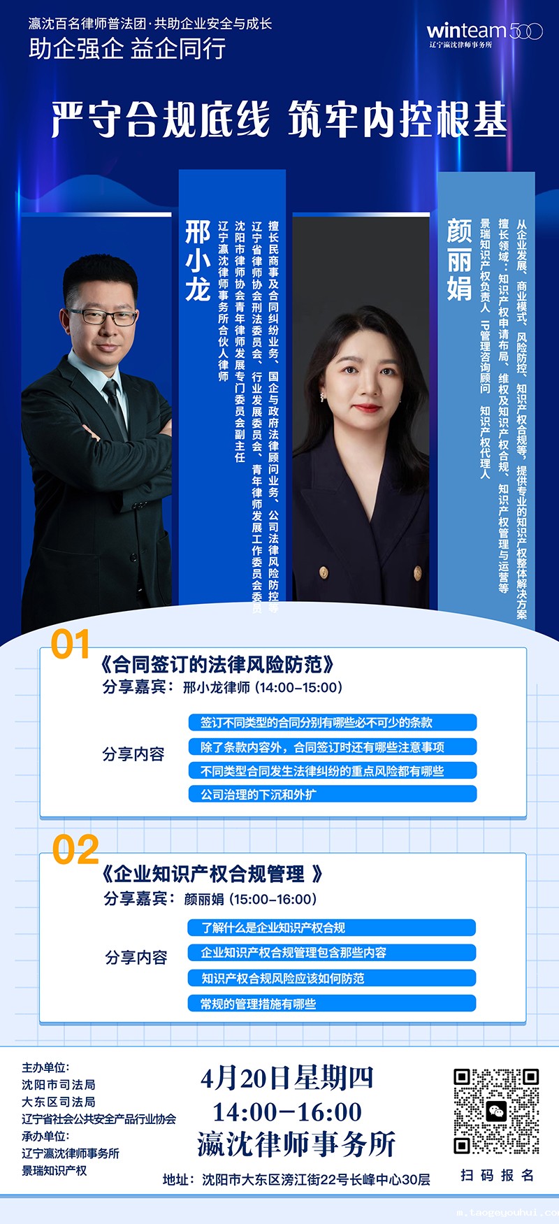 为助力协会成员稳健经营,伟德平台官网首页与辽宁瀛沈律师事务所的17支专业化业务团队、上百名律师,针对企业关心的问题,特邀行业专业律师——邢小龙和资深知识产权专家——颜丽娟,为协会成员进行详细解读!