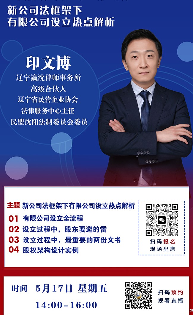 本期直播培训由辽宁瀛沈律师事务所印文博律师主讲。印文博律师是辽宁瀛沈律师事务所高级合伙人,辽宁省民营企业协会法律服务中心主任,民盟沈阳法制委员会委员。