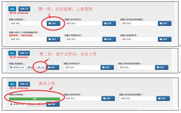 如何上传压缩包?在“批量上传”中,点击“选择”,选中文件后,点击“上传”按钮,上传成功则会显示绿色进度条并提示完成。