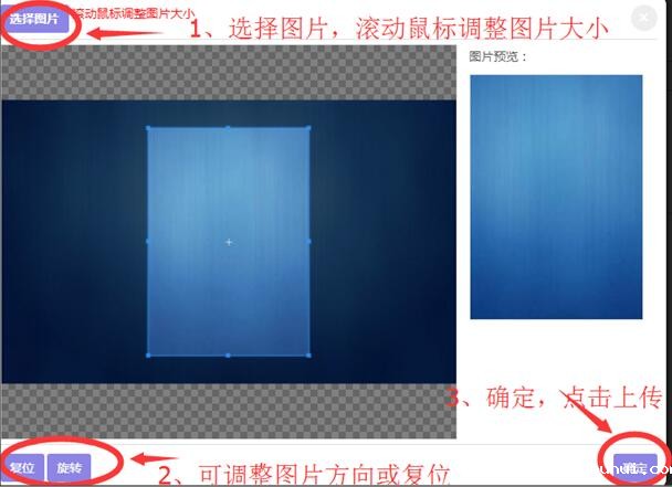 4、上传图片。点击“更换图片”,选择图片(可以滚动鼠标调整图片大小),上传图片。