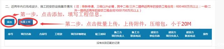 6、关于“近两年内已完成设计、施工的安防设施基本情况”,第一步,点击“添加”填写工程基本信息。第二步,点击批量上传,上传上述工程资料,附件压缩包格式:rar/zip/uzip,每项容量20M以内。