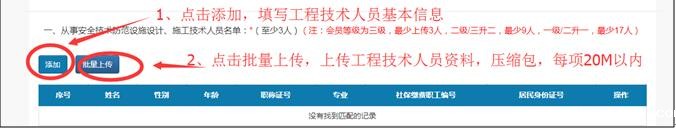 5、关于“从事安全技术防范设施设计、施工技术人员名单”,第一步,点击“添加”填写工程技术人员基本信息。第二步,点击批量上传,上传上述人员资料,附件压缩包格式:rar/zip/uzip,每项容量20M以内。