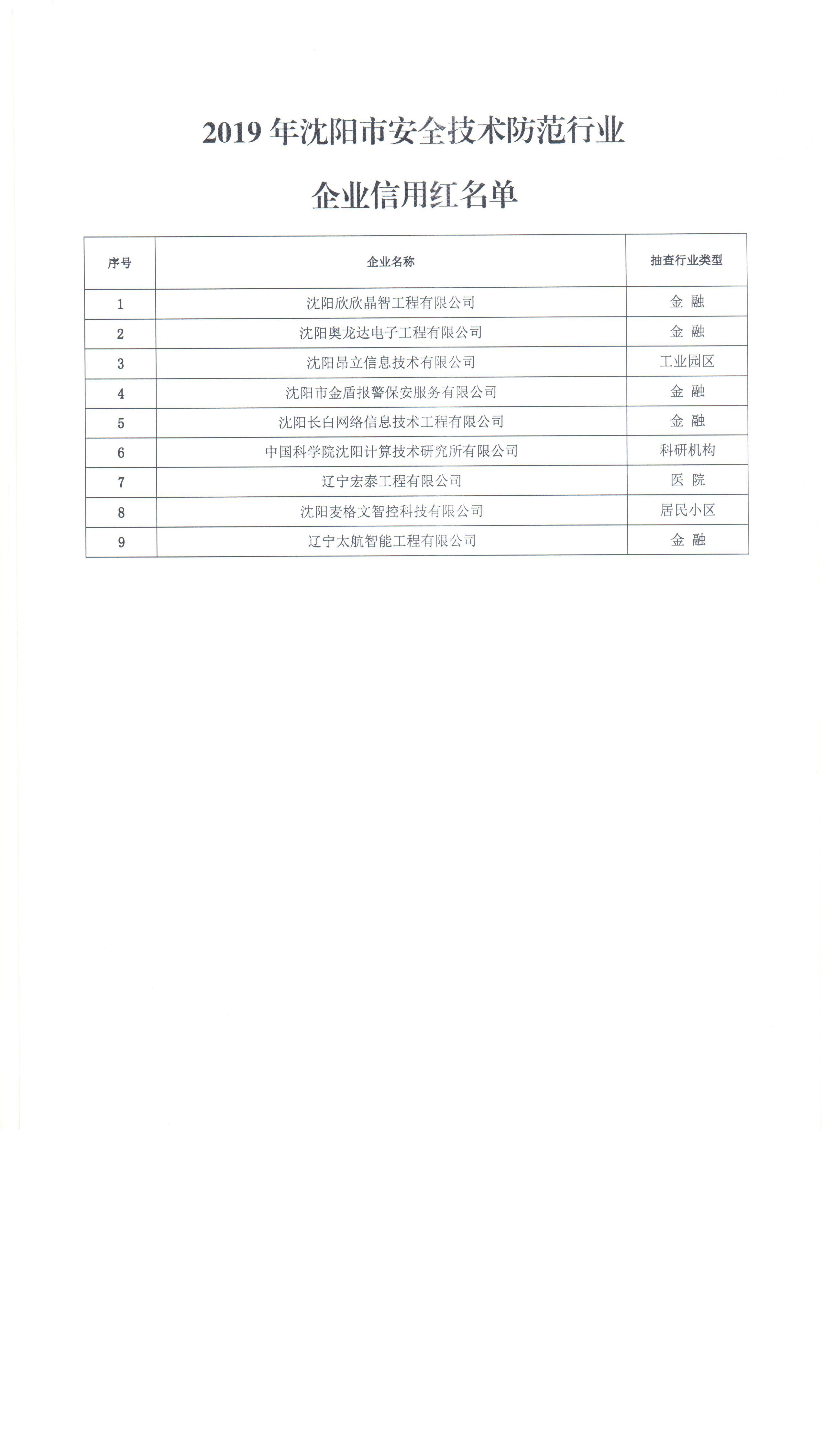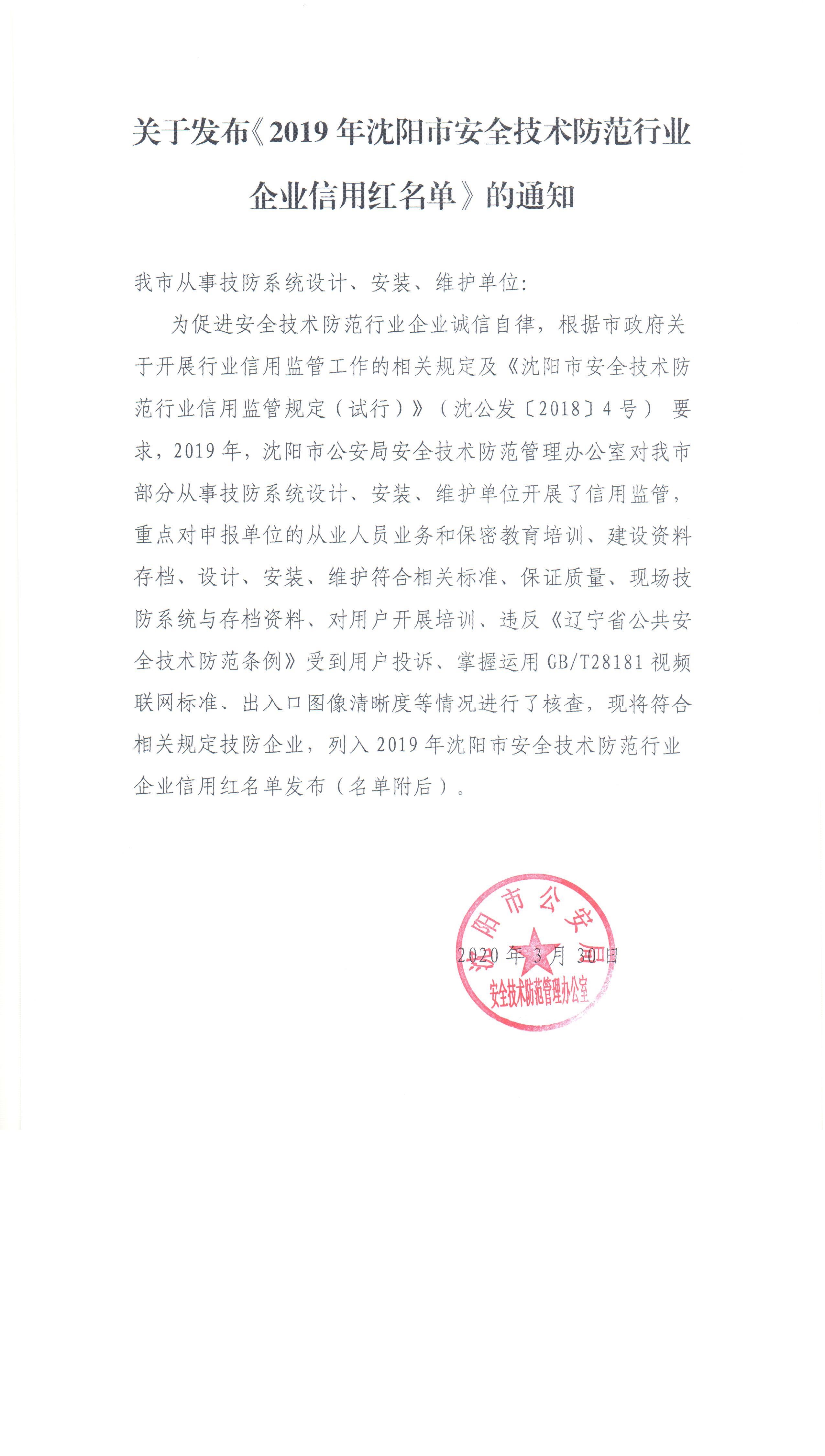 关于发布《2019年沈阳市安全技术防范行业企业信用红名单》的通知